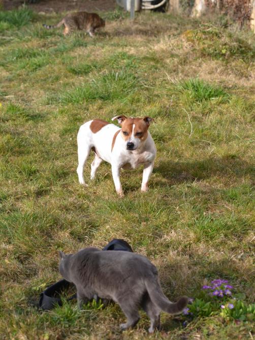 Dès le premier matin, force est de constater que Zé ne montre pas de signe de dépaysement et a pris ses marques tout naturellement, comme si elle avait toujours été là. Bon, il y a des chats mais sans plus, Zé a l'air de trouver normal leur présence. Haïku est plus intéressé que Titounette qui veut se montrer indifférente.